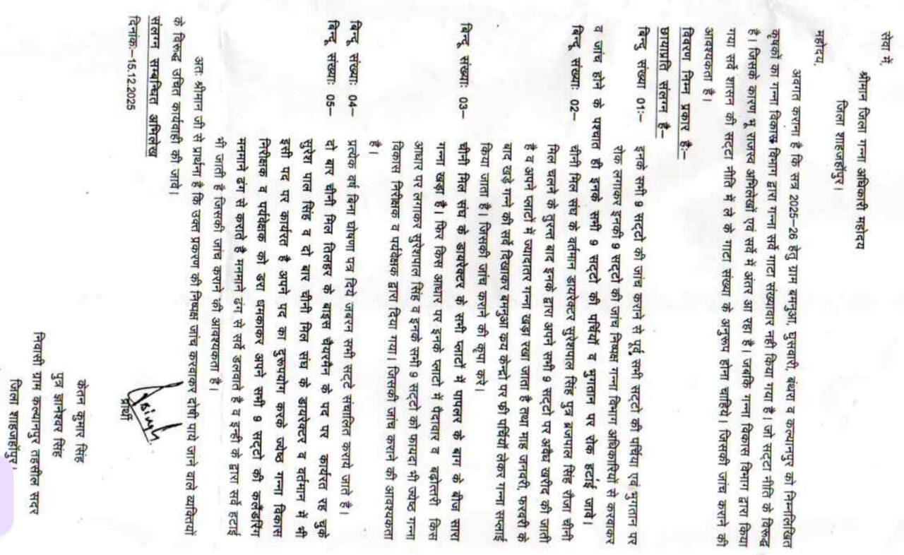तिलहर में गन्ना सर्वे घोटाले का आरोप! सट्टा नीति ताक पर, चीनी मिल–विभाग की मिलीभगत उजागर