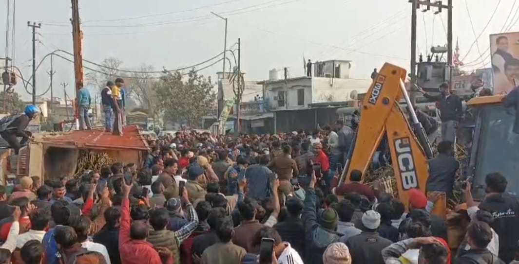 सितारगंज के बिजटी चौराहे पर पलटा गन्ने से भरा ट्रक, दो किशोर दबे