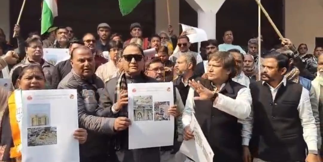 कांग्रेस का डीएम कार्यालय पर प्रदर्शन, अहिल्याबाई होलकर की प्रतिमा क्षतिग्रस्त करने का आरोप