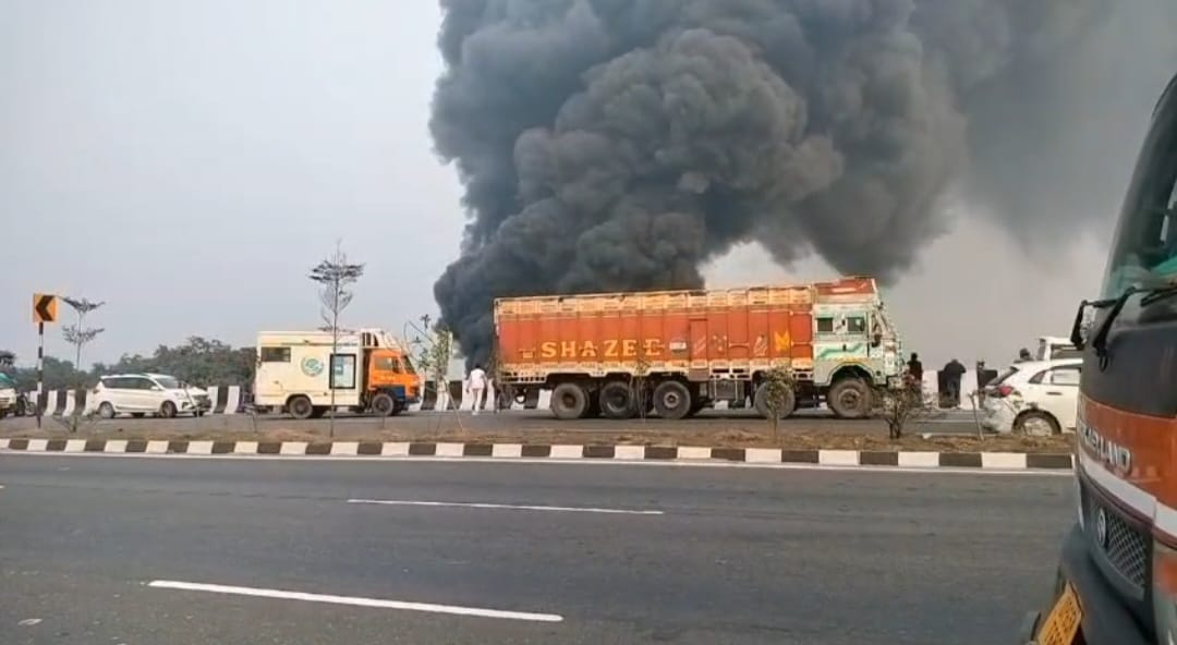 वाराणसी: रिंग रोड किनारे तारकोल में लगी आग, चारों ओर धुआं फैलने से लोगों में दहशत
