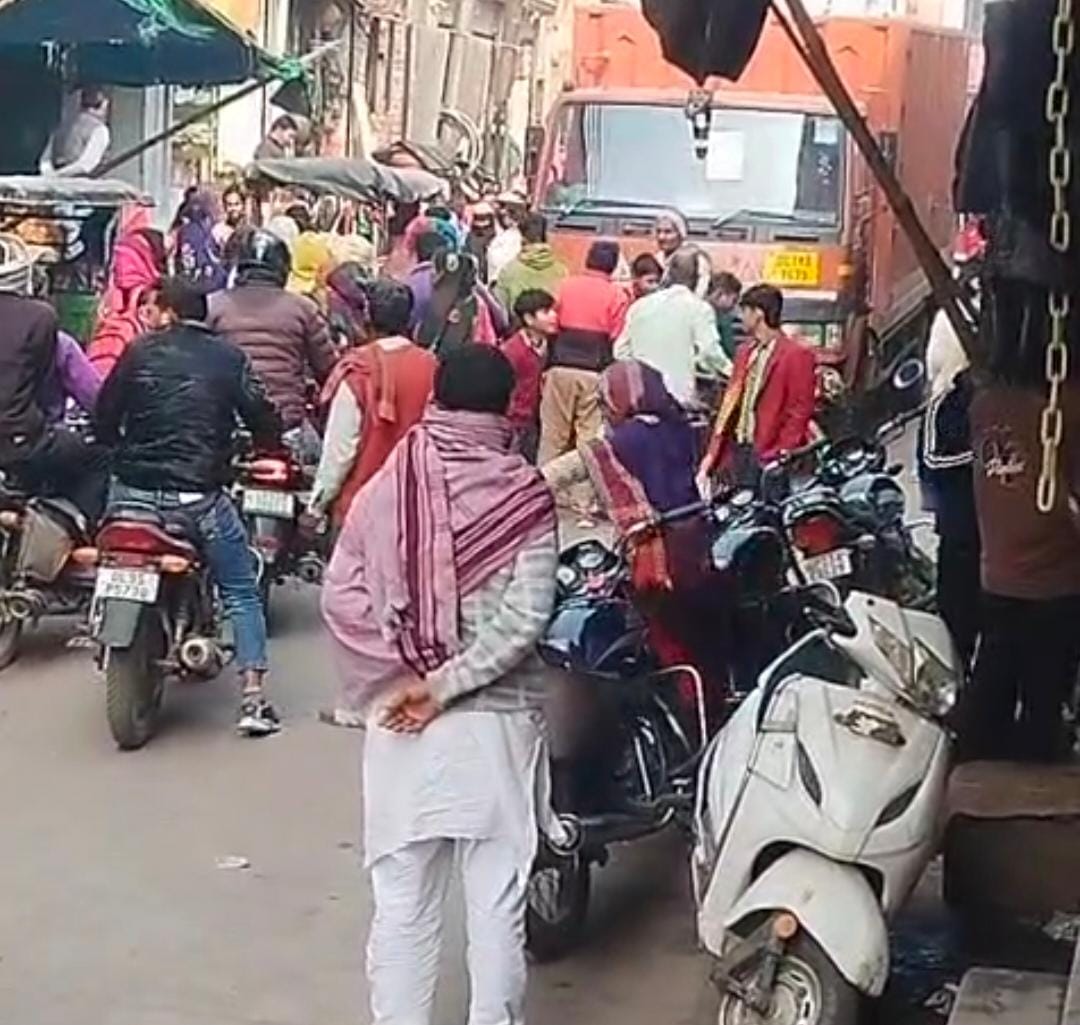 साप्ताहिक बाजार में ‘नो एंट्री’ तोड़ घुसा ट्रक, घंटों लगा रहा भीषण जाम।