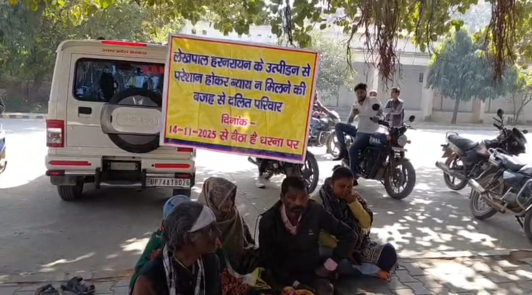 दबंगों व लेखपाल की मिलीभगत से परेशान परिवार का धरना, मंत्री असीम अरुण के आश्वासन पर खत्म