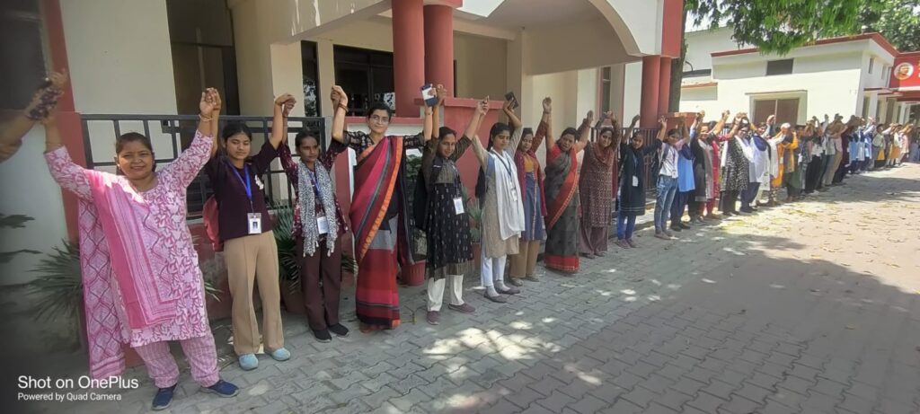 कॉलेज की छात्राओं और शिक्षिकाओं ने हाथों में हाथ डालकर एक लंबी मानव श्रृंखला बनाते हुए नारी सशक्तिकरण का संदेश दिया। कार्यक्रम के दौरान “नारी शक्ति, देश की शक्ति” और “बेटी बचाओ, बेटी पढ़ाओ” जैसे नारों व गीतों से वातावरण जागरूकतामय रहा।